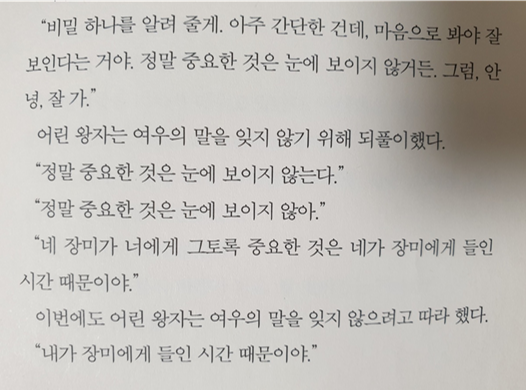 애들과 프랑스마을 놀러가면 항시 나왔던 어린왕자 를 태어나서 처음 읽었네요.