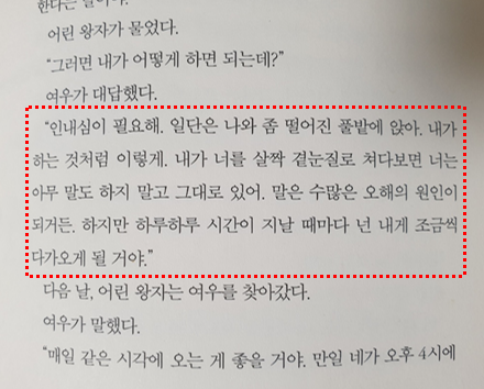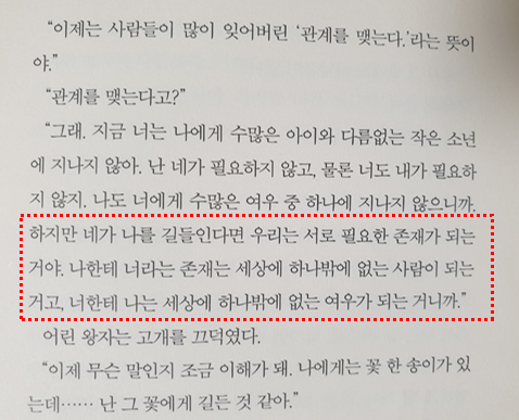[우리는 길들인 것만을 알 수 있어. 사람들은 새로운 것을 알려고 하지 않아. 가게에서 이미 만들어진 물건을 사지. 하지만 친구를 파는 가게는 없다고! 사람들은 이제 친구를 사귈수도 없게 될 거야. 만일 네가 친구를 사귀고 싶다면 나를 길들여야 한다는 말이야]