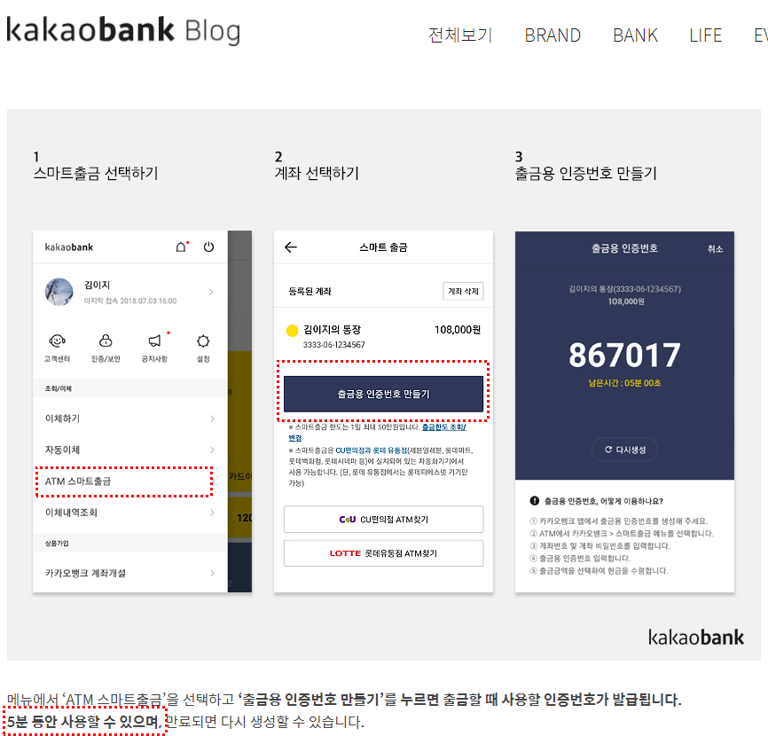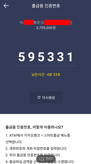 스마트 출금 인증번호 -> 카카오 뱅크 앱에서 생성 [5분간 임시 생성]