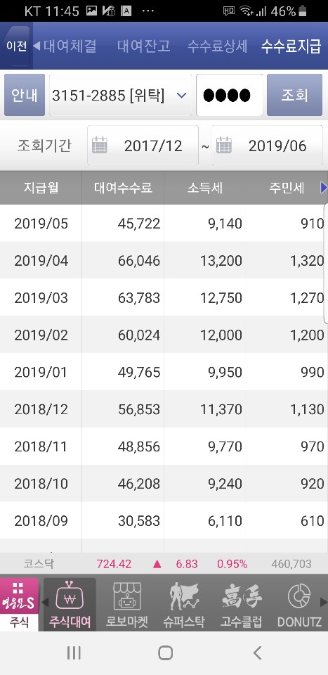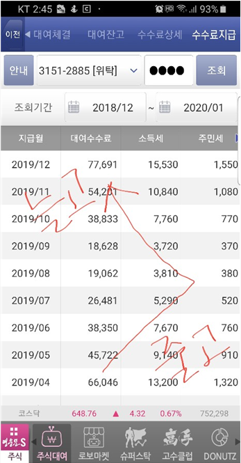 보름 즈음이 되면 주식대여서비스가 계좌로 입금됩니다.