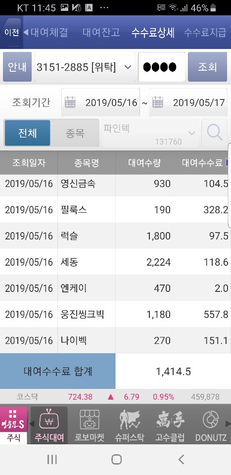 서두에 캡쳐처럼 필룩스, 파인텍, 웅진씽크빅, 하이트진로 등 급등에 따른 공매도가 많이 있었던 것을 수수료 입금되는 것을 보고도 느낄 수 있네요.