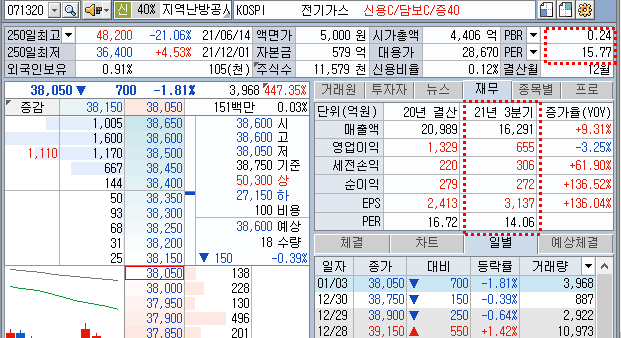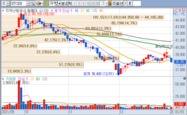 지역난방공사 역시 재미없는 공기업이 70%를 차지하는 저 거래량 종목입니다.