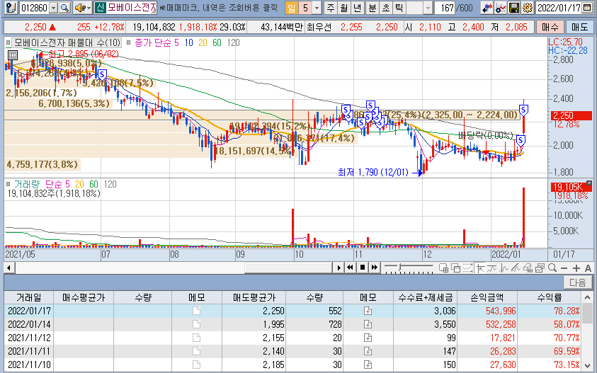 모베이스전자 역시 전 거래일에 20%를 정리했는데,
