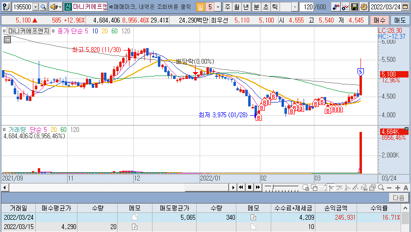 금일 마니커에프앤지에서 한방 슈팅을 쏘았네요.