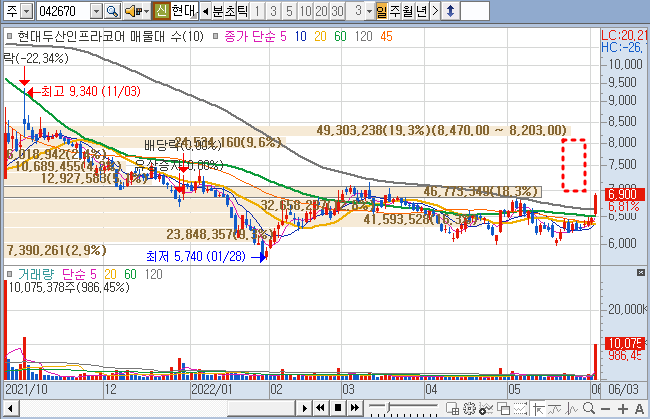 7,000~8000원 사이 매물대가 단단하니 어떤 식으로든 싸움이 벌어질 듯합니다.