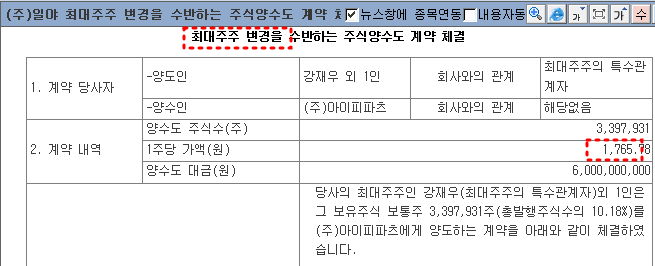 최대주주 변경 60억원, 1주당 가액 1,765원