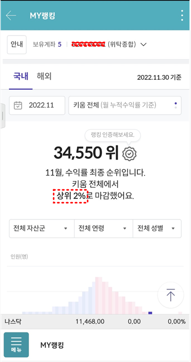 물론 투자 연령과 자기 자산군에 대한 순위도 보여주네요