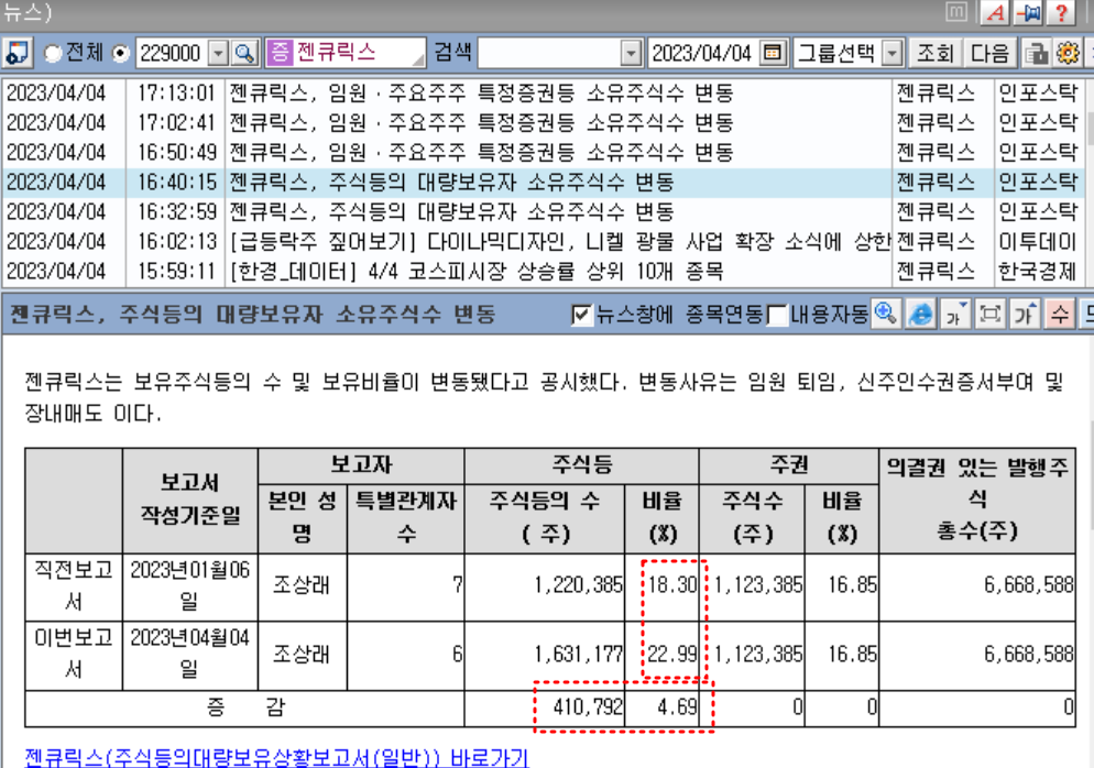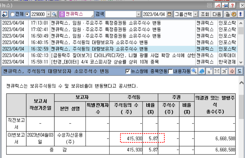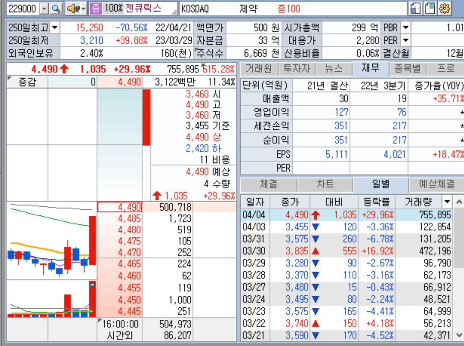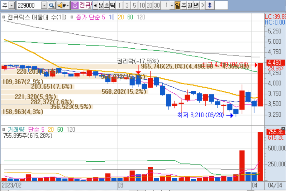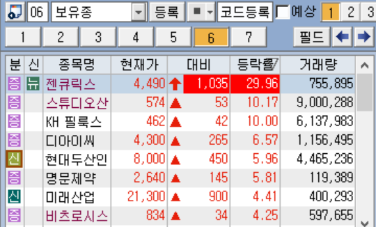 최근 유증 종목이었던 젠큐릭스 상한을 비롯하여