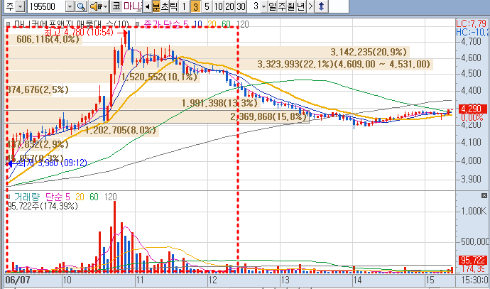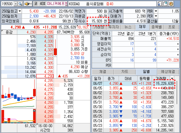 1500만 주 주식에서 금일 11% 상승 1500만주 거래량입니다.