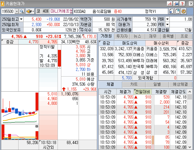 마니커에프엔지 대주주 20%의 보유량을 빼면 900만 주가량 움직일 수 있지만