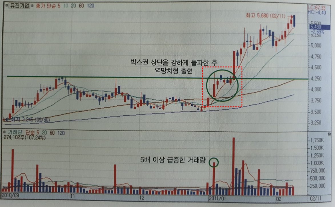 박스를 뚫으면서 8배 거래량 -> 다음날 음봉 거래량 전일의 30% 감소