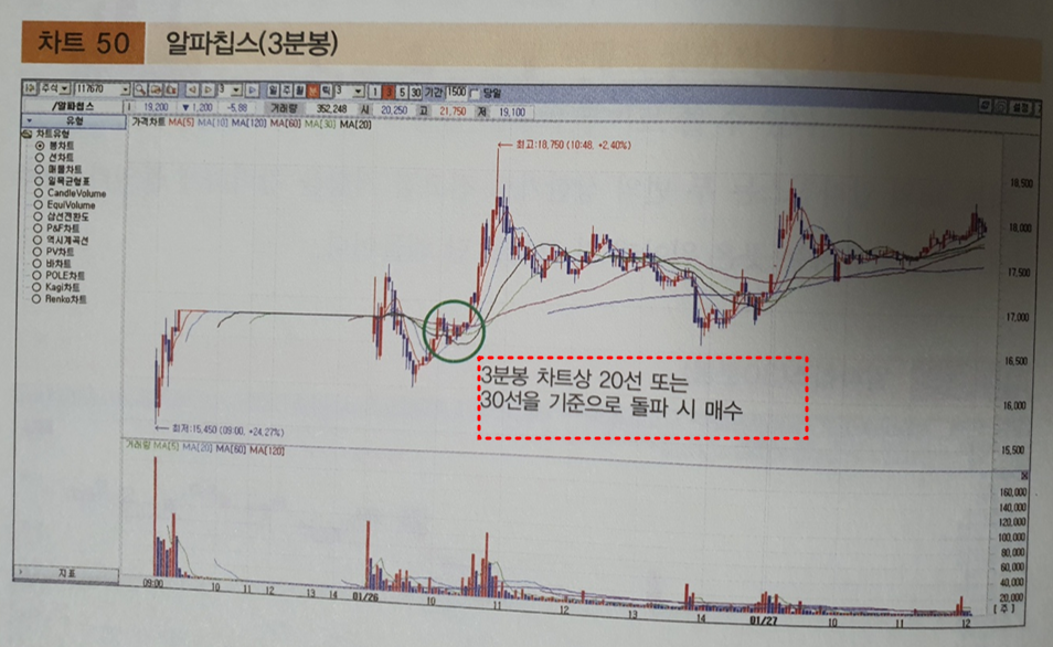 3분봉 차트상 20선 또는 30선을 기준으로 돌파 시 매수