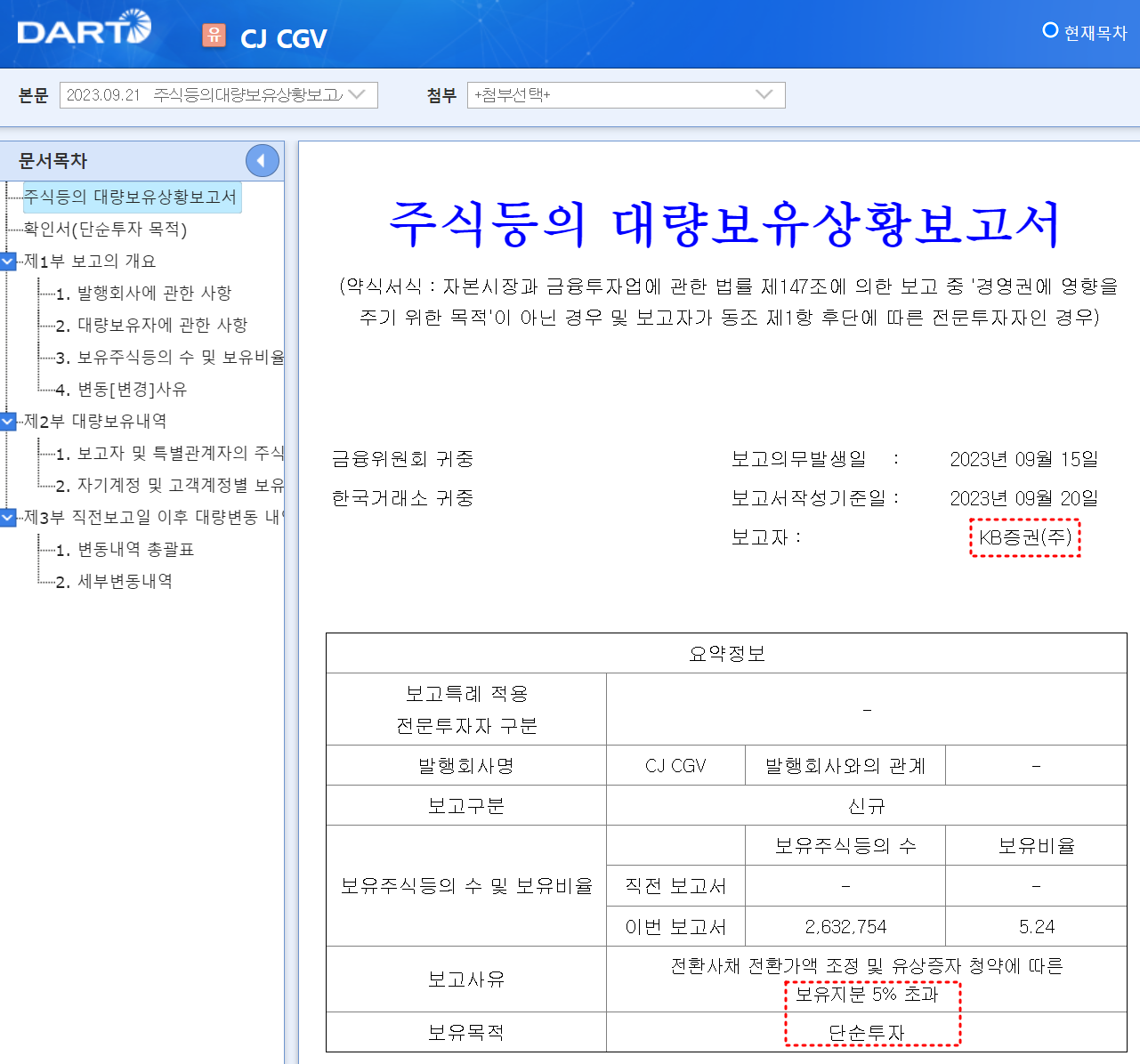 주주 비율 보면서 우연히 9.21일 공시에 KB증권에서 단순목적에서 5% 이상 보유 보고서인데
