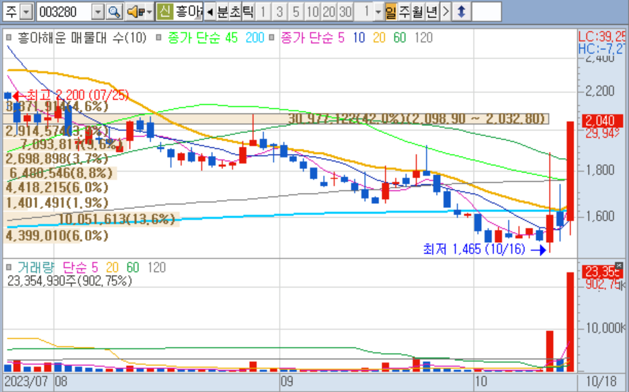 [핀포인트뉴스 이경선 기자] 흥아해운 주가가 크게 오르고 있다.18일 한국거래소에 따르면 이날 오후 29.94% 올라 2040원에 거래되고 있다.주가는 급등이후 하락추세에서 벗어나려 하고 있다.기관