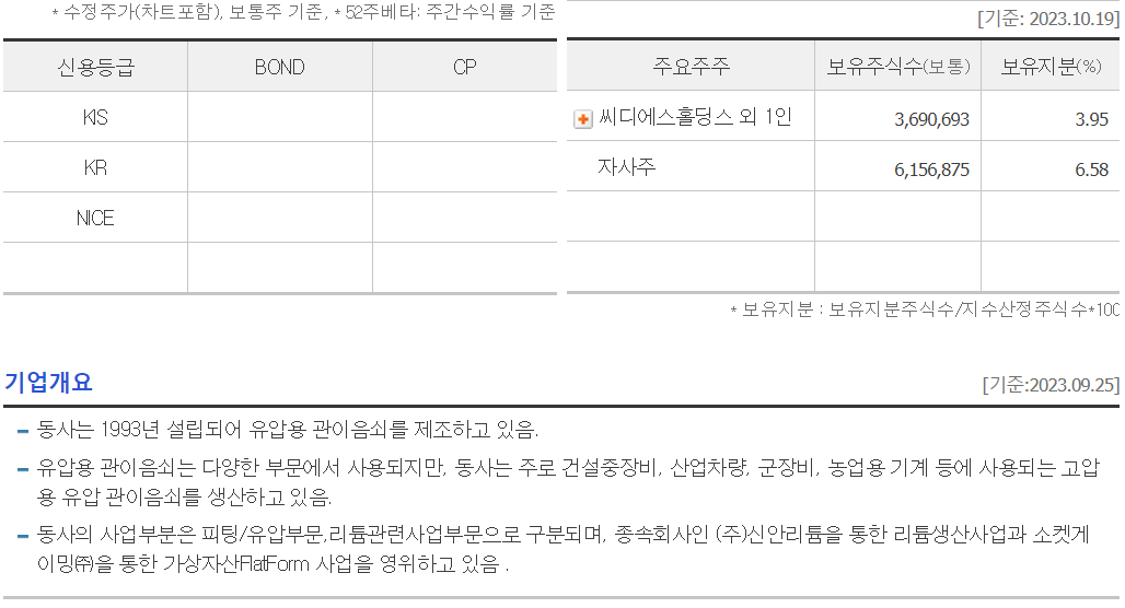 ◐ 시총 : 2231 억 ◐ PER : 6.9 ◐ PBR : 2.1 ◐ 부채율 : 35 % ◐ 이익잉여금 : 117 억
