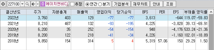◐ 시총 : 219억 ◐ PER : - ◐ PBR :0.4 ◐ 부채율 : 119 %◐ 배당 : - ◐ 이익잉여금 : 억